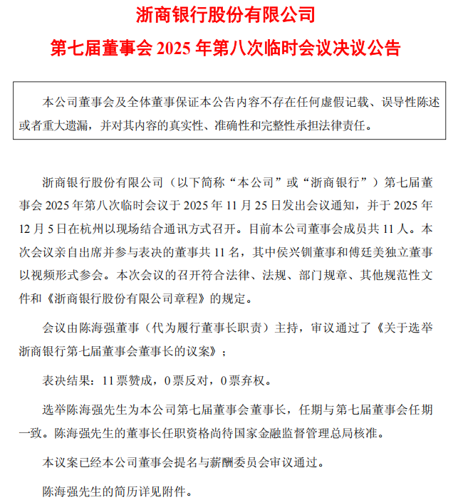 12月5日最信得过的网络配资,浙商银行股份有限公司第七届董事会2025年第八次临时会议决议公告显示,审议通过了《关于选举浙商银行第七届董事会董事长的议案》,选举陈海强先生为本公司第七届董事会董事长,任期与第七届董事会任期一致。陈海强先生的董事长任职资格尚待国家金融监督管理总局核准。