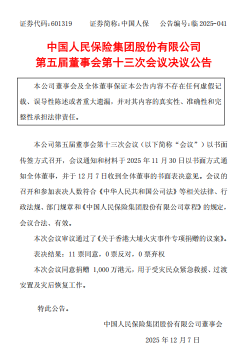 12月7日,中国人民保险集团股份有限公司第五届董事会第十三次会议决议公告显示,会议审议通过《关于香港大埔火灾事件专项捐赠的议案》,会议同意捐赠1,000万港元实盘配资有哪些,用于受灾民众紧急救援、过渡安置及灾后恢复工作。